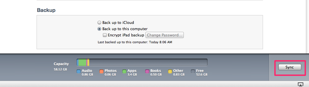 A final issue of note that came up during this process--a lot of my apps disappeared off my iPhone after the update. There were two options to remedying this--going to the App Store and redownloading all my purchased apps or syncing my apps from my computer. Going to the App Store and using the iCloud is not as easy as one would think. Each time you download an app from the iCloud, you are redirected to the home screen. Then you have to flip back to the App Store to download another app, at which point you are returned to the home screen. It's like running in virtual circles. No fun. So after three stubborn attempts to continue this, I decided on just syncing from my computer. When you look at your iPhone Management Screen (that's what I'm calling the page you see in iTunes), you choose to Sync All Apps.